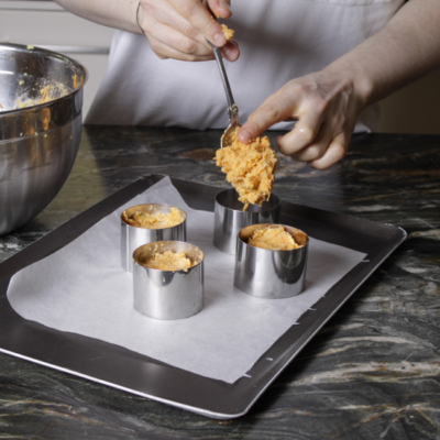 7In kleine Dessertringe geben. Die Ringe nicht ganz bis an den Rand füllen, ca. 1 cm oben und seitlich für die Cashew-Vanille-Creme freihalten. Kuchenteig kaltstellen.