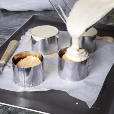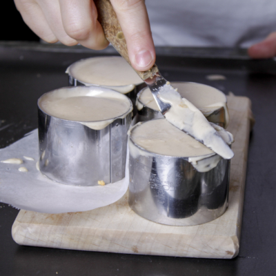 10Die Creme in die Dessertringe gießen, Oberseite glatt streichen, überschüssige Creme entfernen.