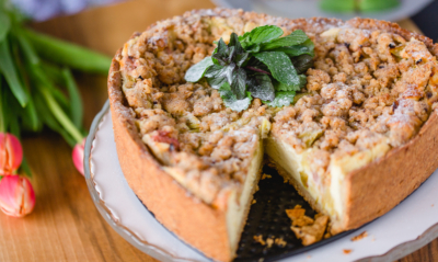 1Rhabarber waschen, schälen und in kleine Stücke schneiden. Mit Kristallzucker bestreuen, gut durchmischen und zur Seite stellen.