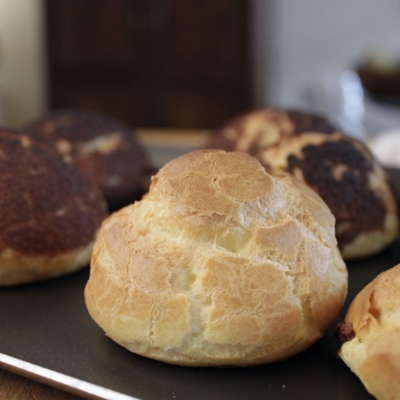 5Den Teig in einen Spritzsack mit glatter Tülle Nr. 8 geben, auf ein Antihaft-Blech (alternativ Blech mit Backpapier) spritzen. Für einen großen Choux, zirka 5 cm aufspritzen, für kleine Chouquetten zirka 3 cm aufspritzen. Die Choux großzügig am Blech verteilen und mehrere Zentimeter Abstand einhalten, diese dehnen sich beim sehr backen aus.