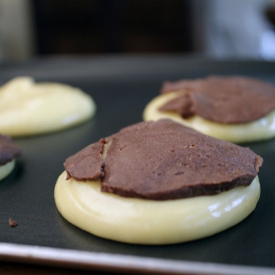 6Craquelin Teig aus dem Kühlschrank nehmen, beide Backpapiere abziehen und runde Stücke mit einem Keks-Ausstecher ausstechen, die der Größe des Choux entsprechen. Vorsichtig mit einer Palette auf den Choux legen. Craquelin als ganzes auf den Choux setzen oder durchreißen für rissige Textur.