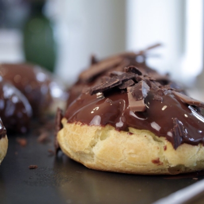 1Den Choux mit der Oberseite in Schokolade tauchen, überschüssige Schokolade am Schüsselrand abstreichen. Nach Belieben mit Schokostücken bestreuen.