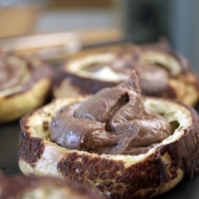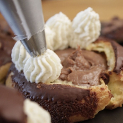 4Die untere Hälfte mit Schokoladencreme füllen. Für besonders schöne Choux, den Deckel mit einem runden Keks-Ausstecher in der entsprechenden Größe in Form bringen.