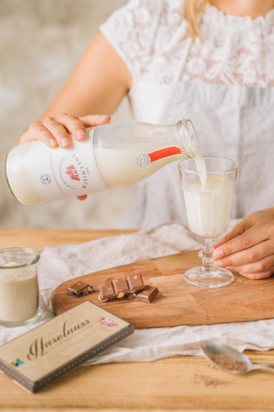 4Milch (alternativ Haferdrink) in ein mit Eiswürfeln gefülltes Glas geben.