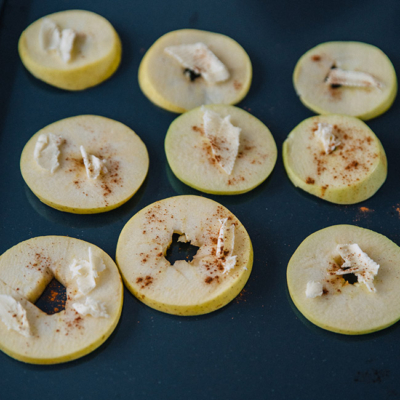 4Die Äpfel in ca. 4 mm dicke Scheiben schneiden und auf einem Backblech verteilen. Butterflocken und Zimt darauf verteilen, mit etwas Ahornsirup beträufeln und ca. 20 Minuten im Rohr backen.