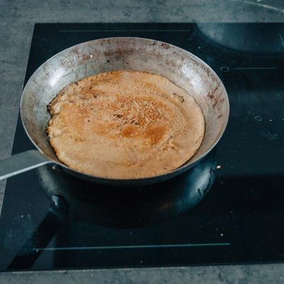 5Butter in einer Pfanne zerlassen und die Crêpes ausbacken. Crêpes mit Mandelmus-Karamell bestreichen und mit den Bratäpfeln belegen.