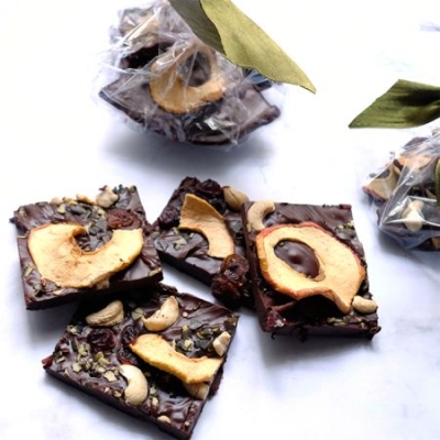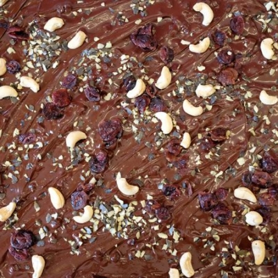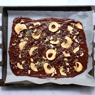 4Die gehackten Kürbiskerne, den Nussmix und die Apfelchips gleichmäßig auf der warmen Schokolade verteilen.
