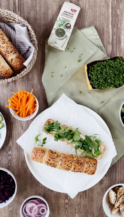 6Dann mit dem Dip bestreichen, frische Kresse darüber streuen und Deckel drauf.