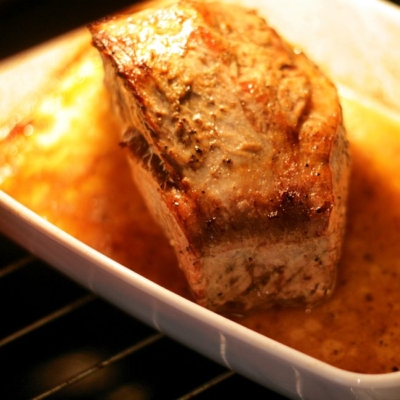 3Nun braten wir das Fleisch für ca. 40 Minuten im Backrohr (Wichtig: Immer wieder mit Bratensaft und etwas Suppe übergießen).