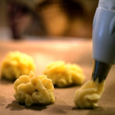 6Für das Kartoffelpüree zerstampfen wir die geschälten Kartoffeln, würzen sie mit Salz, Pfeffer und Muskat und geben Milch (bzw. Schlagobers für mehr Cremigkeit) hinzu, bis die gewünschte Konsistenz erreicht ist. Das Püree füllen wir in einen Dressiersack, spritzen kleine „Kartoffel-Krapferl“ auf ein Backblech und stellen es in das Backrohr (für ca. 10 Minuten)