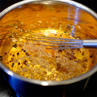 4Den Essig gemeinsam mit dem Zucker aufkochen, bis der Zucker aufgelöst ist. Nun Salz, Senfkörner, Kümmel, Pfefferkörner und Wasser dazu geben und für 5 Minuten leicht köcheln lassen.