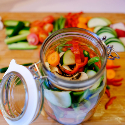 5Das Gemüse abwechselnd und bunt in das große Einweckglas schichten, dabei den oberen Rand ca. 1,5 cm frei lassen.