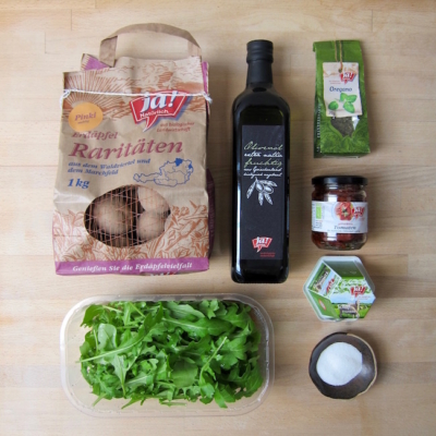 7Mit den getrockneten Tomatenstreifen und Rucola belegen und mit einem kleinen Rucola-Salat dazu servieren.