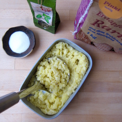 1Erdäpfel weichkochen (ca. 35 Minuten) schälen und mit einem Erdäpfelstampfer zerstampfen oder durch eine Erdäpfelpresse quetschen – am besten direkt in einen mitnehmbaren Behälter.