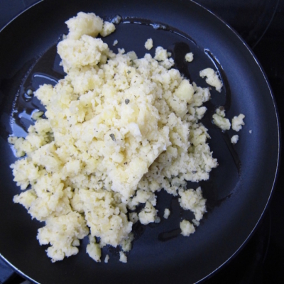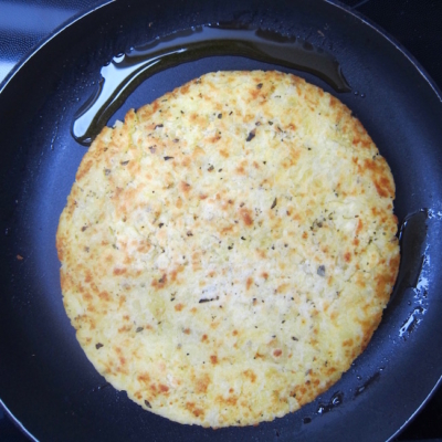 32 EL Olivenöl in einer Pfanne erhitzen (wer den Geschmack mag, kann auch das Öl von den getrockneten Tomaten verwenden). Die gepressten Erdäpfel in die Pfanne geben, mit einem Pfannenwender von oben flachdrücken und von den Seiten zu einem runden Fladen formen. Je nach Dicke für 5 bis 6 Minuten knusprig braten.
