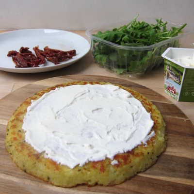 6Den beidseitig knusprig gebratenen Erdäpfelfladen auf ein Brett stürzen, kurz abkühlen lassen und mit Schaffrischkäse bestreichen.