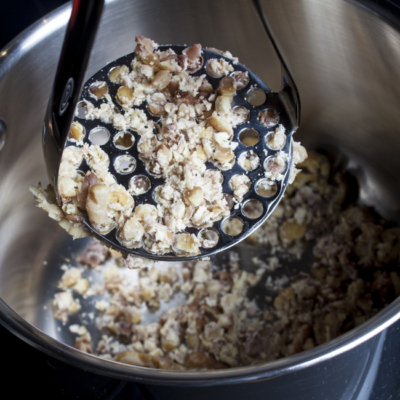 1Milch in einem Topf erhitzen. Die Maroni in einen anderen Topf geben und mit dem Kartoffelstampfer oder einer Gabel zerdrücken. Heiße Milch über die Maroni rühren und zu einem cremigen Püree rühren. Für besonders feines Püree mit einem Stabmixer pürieren. Püree nochmal erwärmen.