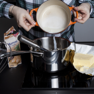 2Butter dazugeben, salzen, pfeffern und mit Muskatnuss würzen. Abschmecken und warm servieren.