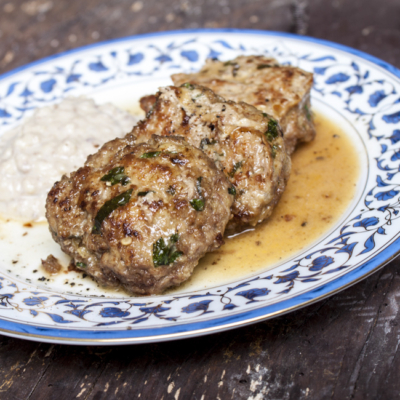 6Die Pfanne mit heißer Hühnersuppe ablöschen und auf höchster Stufe einige Minuten reduzieren. Zum Schluss mit Butter montieren, Cognac dazugeben. Mit dem Stabmixer kurz aufschäumen. Mit den faschierten Laibchen servieren.