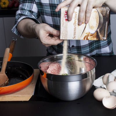 3Faschiertes, gehacktes Gemüse, weiches Weißbrot, Semmelbrösel, Eier, Salz und Pfeffer gut mit den Händen kneten. Zu runden Laibchen formen.