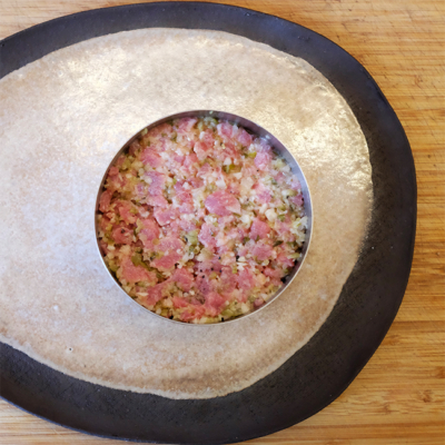 6Das Tatar mit Hilfe eines Metallrings auf zwei Teller schichten, dabei das Fleisch sehr fest drücken. Den Ring entfernen und mit den Butter-Semmelwürfeln toppen.