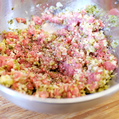 1Das Bio-Fleisch mit einem Küchentuch abtupfen und mit einem sehr scharfen Messer extrem fein würfeln. In eine Schüssel geben.