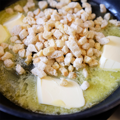 5Die Butter in einer beschichteten Pfanne erhitzen und die Semmelwürfel darin goldgelb rösten. Anschließend zum Abtropfen auf Küchenrolle geben.