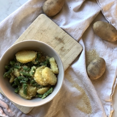 5Erdäpfelscheiben und Fisolen dazu geben und alles zusammen in der Pfanne anrösten.