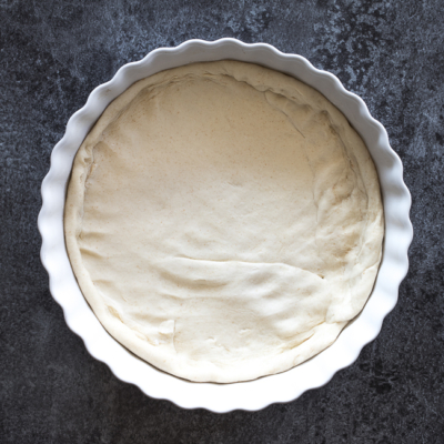 6Teig aus dem Kühlschrank nehmen und dünn ausrollen. Teig in die vorbereitete Form geben und festdrücken. Mit einer Gabel vorsichtig Löcher hineinstechen.