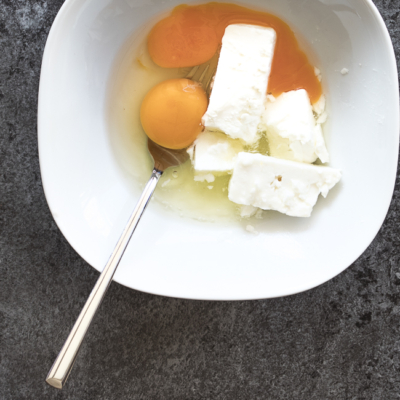 3Schafskäse mit einer Gabel zerdrücken. Eier in einer Schüssel verquirlen und mit Schafskäse vermischen. Mit Salz und Pfeffer abschmecken.