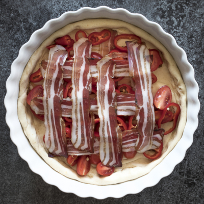 7Speck gitterförmig auslegen. Tomaten und Paprika gleichmäßig darauf verteilen. Eine zweite Schicht Speck gitterförmig darauflegen. Eier-Käse Mischung darüber geben und bei 180°C, Ober- und Unterhitze, 45 Minuten backen.