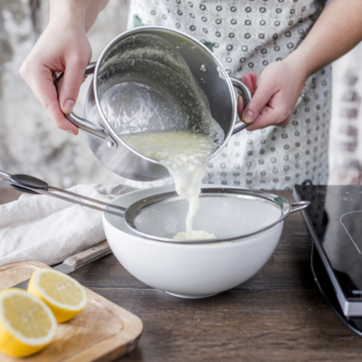 8Dann die Masse durch ein Mulltuch oder ein sehr feines Sieb abseihen.
