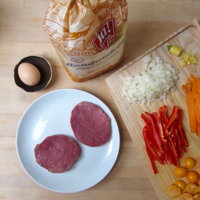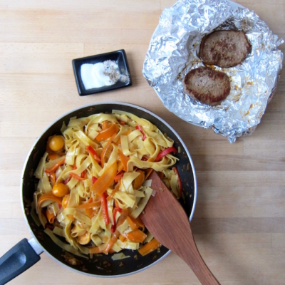 8Die Nudelpfanne auf zwei Tellern anrichten, die Minutensteaks mit Salz und Pfeffer würzen und auf die Nudeln setzen.