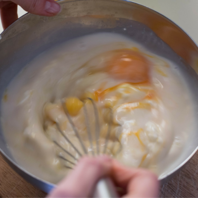 3Milch, Eier, Creme Fraîche, Schlagobers, Zucker und die Zitronenschalen mit einem Schneebesen verquirlen.