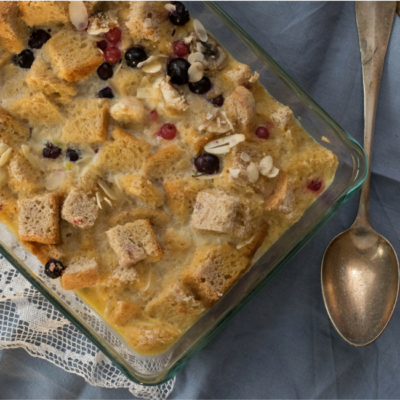 5Striezel oder Toastbrot mit dem Obst und den Mandeln vermischen und in eine Auflaufform geben.