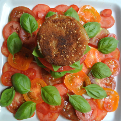 8Die Ochsenherztomate drei Mal quer durchschneiden, (wenn sie nicht von alleine steht, auch an der Unterseite ein kleines Stück abschneiden). Schnittfläche salzen und pfeffern, mit Basilikumblättern belegen (dies ist sowohl für den Geschmack wichtig, als auch damit die Panier nicht durch die Tomate aufweicht!), auf den Mozzarella wieder Basilikum legen, dann einige Avocadoscheibchen, dann die nächste Tomatenscheibe, salzen, pfeffern, Basilikum, Mozzarella, Basilikum, rote Zwiebel, Avocado, Tomate, salzen, pfeffern, Basilikum, Mozzarella, Basilikum, Avocado und zu guter letzt den „Deckel“ der Ochsenherztomate. Zahnstocher sind hilfreich, um den „Turmbau“ zu fixieren.