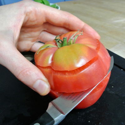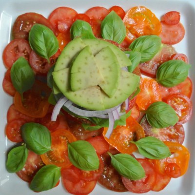6Die gewaschenen Tomaten mit einem sehr scharfen Messer so dünn wie möglich in Scheibchen schneiden und auf einem Teller anrichten. Zwiebel in sehr feine Streifen schneiden, Avocado in Scheiben schneiden und evtl. mit etwas Zitronensaft beträufeln.