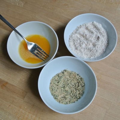 9Dann die Panierstation vorbereiten: 1 Ei mit etwas Salz verquirlen und in eine kleine Schüssel geben. Brösel-Kürbiskern-Mischung und Mehl ebenso bereitstellen.