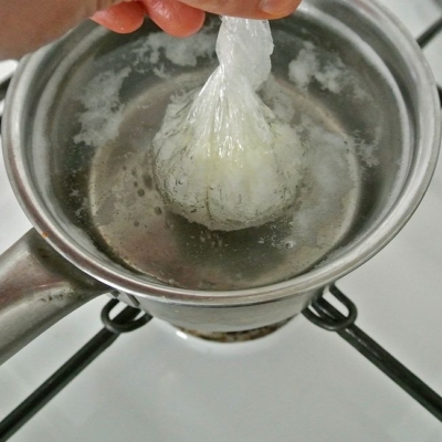 8Ein Ei nach dem anderen vorsichtig im Klarsichtfolien-Säckchen ins siedende Wasser halten und ca. 5 Minuten garen.