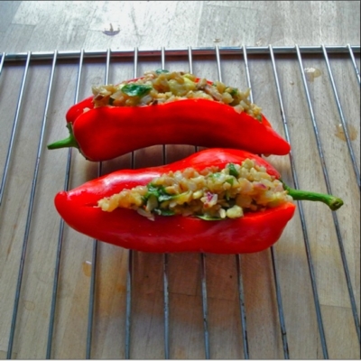 7Die Spitzpaprika waschen, vorsichtig an einer Seite einschneiden und die Kerne entfernen. Die Schoten mit der Reis-Pilz-Avocado-Mischung befüllen und auf einen Grillrost legen und im vorgeheizten Backrohr ca. 20 Min. grillen.
