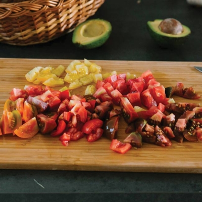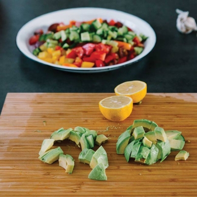 5Gurke, Avocadofruchtfleisch und Paradeiser würfeln.