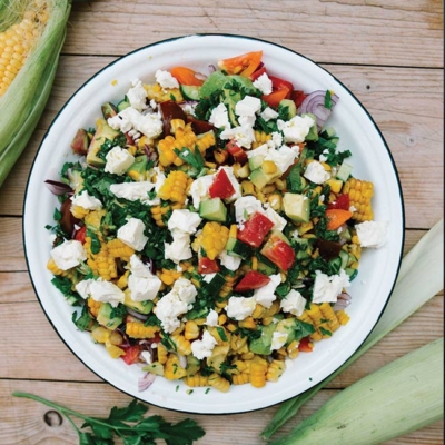 7Maiskörner, Gurke, Avocado, Paradeiser, Zwiebel und Kräuter vermischen und in einer Salatschale anrichten, mit dem Dressing beträufeln und den Feta krümelig darauf verteilen.