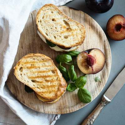 32 Brotscheiben mit Mozzarella, Pflaumen und Basilikum belegen, vorsichtig mit etwas Balsamico beträufeln und mit den übrigen Brotscheiben abschließen.