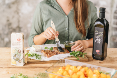 2Mit etwas Olivenöl und Knoblauchzehen im Ofen garen. In einem Schüsserl Olivenöl mit der Gewürzmischung verrühren und etwas ziehen lassen.