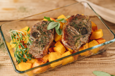 Geholfene Lammkotelettes mit Ofen-Süßkartoffeln
