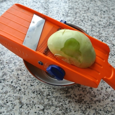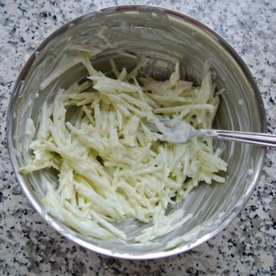 1Auch hier schneide ich nur die holzigen Teile der Schale weg. Dann hoble ich die Knolle in feine Streifen und gebe den Sauerrahm dazu. Alles gut verrühren, mit Salz und Pfeffer abschmecken.