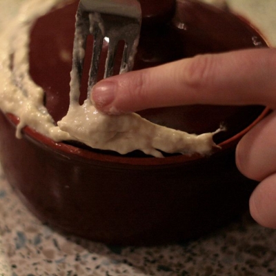 3Wir schlichten Fleisch und Gemüse in kleine ofenfeste Töpfe oder einen großen Römertopf. Obendrauf kommt zerbröselter Feta. Aus Mehl und Wasser mischen wir einen dicken Leim, mit dem wir den oder die Töpfe luftdicht verschließen. (Alternative: Ein Bratschlauch!)