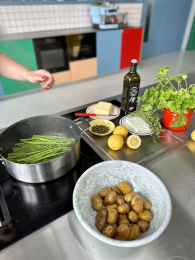 Dieses Gericht steht in weniger als 15 Minuten auf den Tisch und schmeckt einfach nach Sommer: Knackiger grüner Bio-Spargel, cremiger Bio-Feta, und Bio-Erdäpfel mit perfektem Biss. Die Zitronen-Kapern-Butter vollendet das Gericht noch und ein Sommerabend kann kommen.
