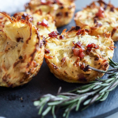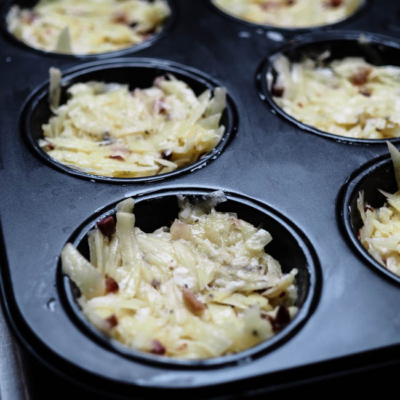5Ein Muffinblech mit der Butter ausfetten, dann die Vertiefungen mit der Kartoffelmasse füllen.