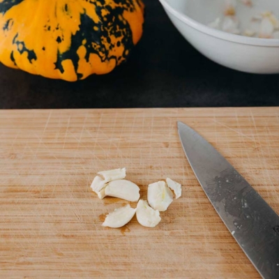 1Die Schalotten schälen und vierteln, Knoblauch schälen und mit der flachen Seite eines großen Messers andrücken.